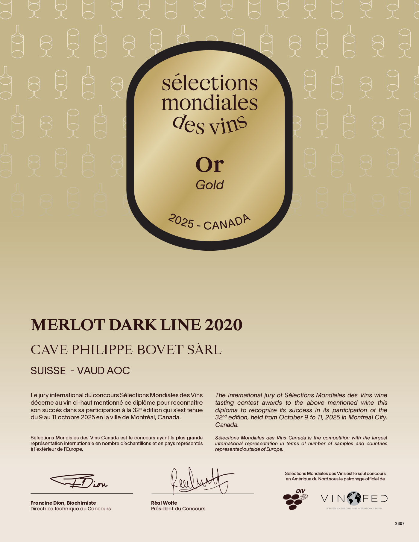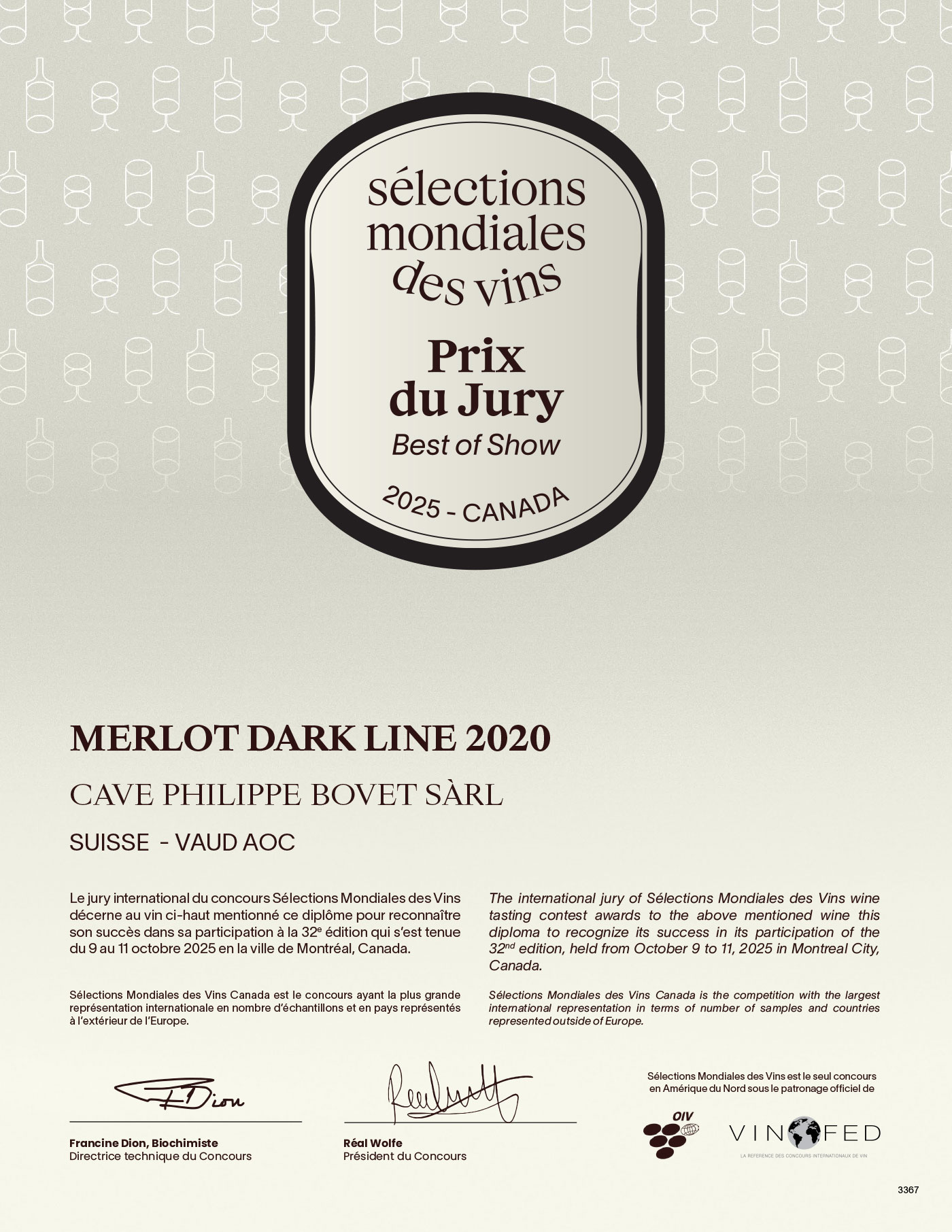 Une reconnaissance qui souligne la qualité, l’équilibre et l’expression aromatique du Merlot Dark Line 2020, produit dans l’AOC Vaud.
